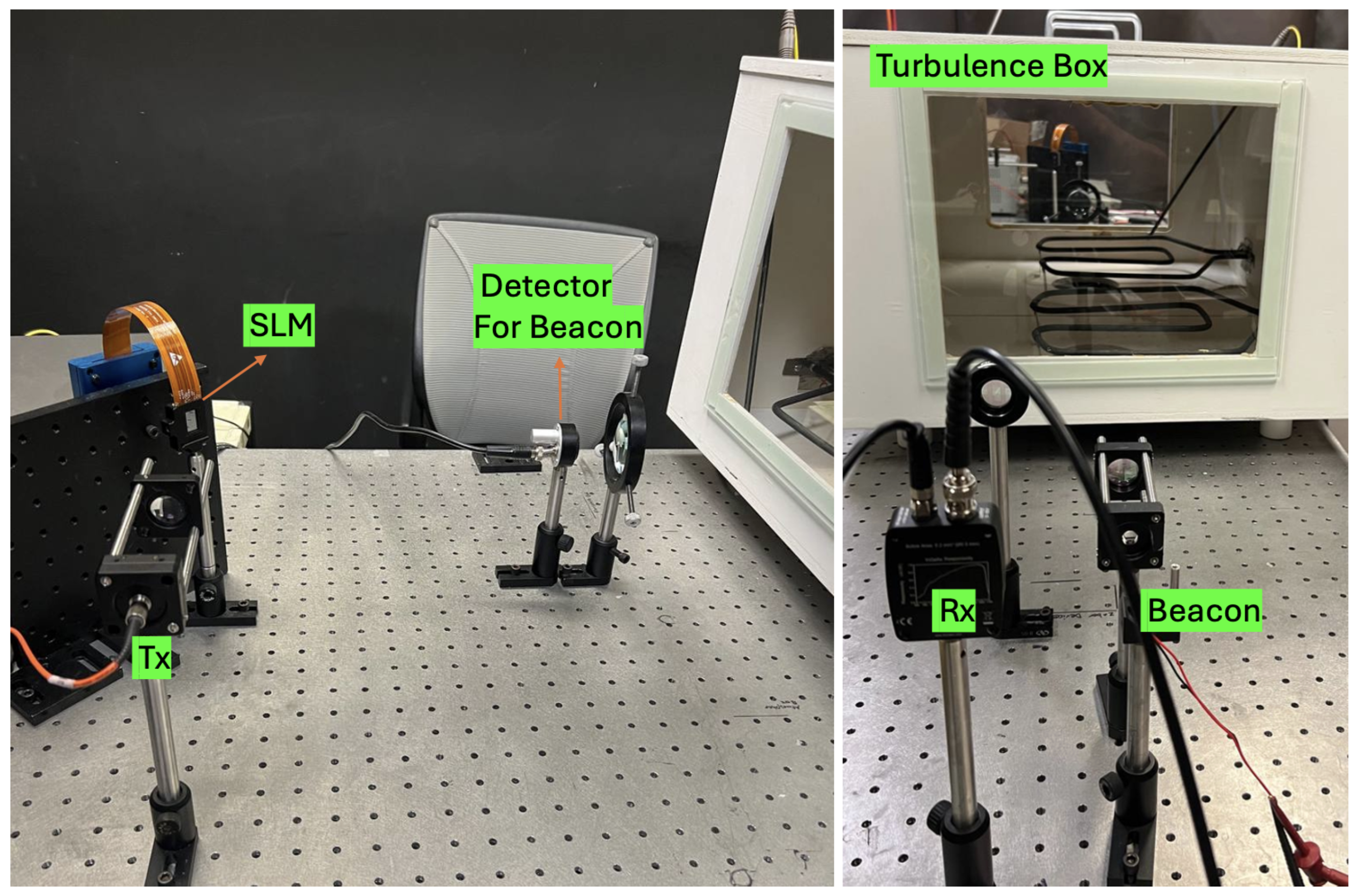 Figure 2, replicates an FSO communication channel under controllable turbulence conditions. A pseudorandom bit sequence (PRBS) is first OOK-modulated at 850 nm using a Highland Technology J724 electro-optic converter operating at 10 kHz, emulating the uplink data signal. This beam is subsequently phase-shaped by a HOLOEYE ERIS-1.1 SLM, which is an LCOS device offering