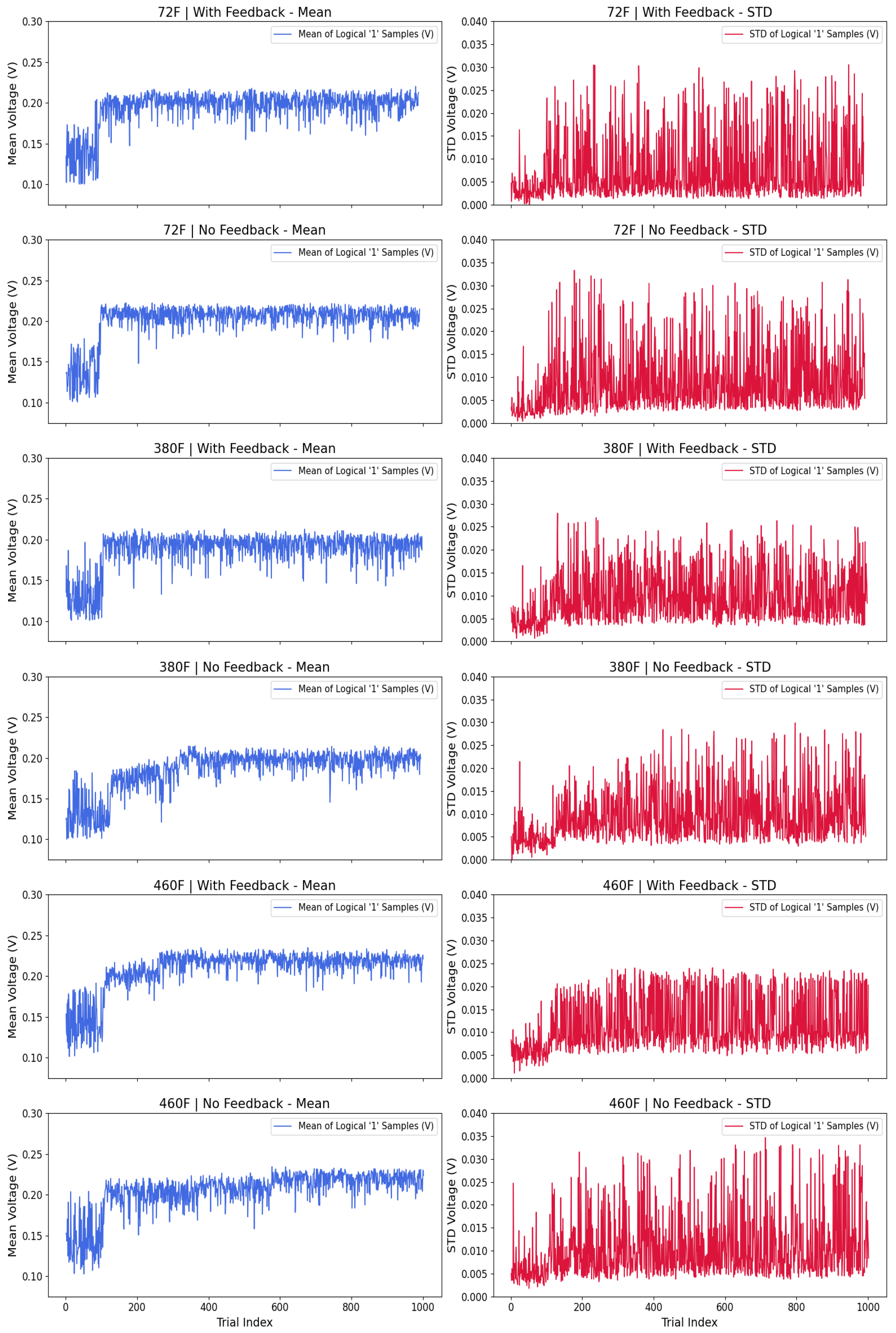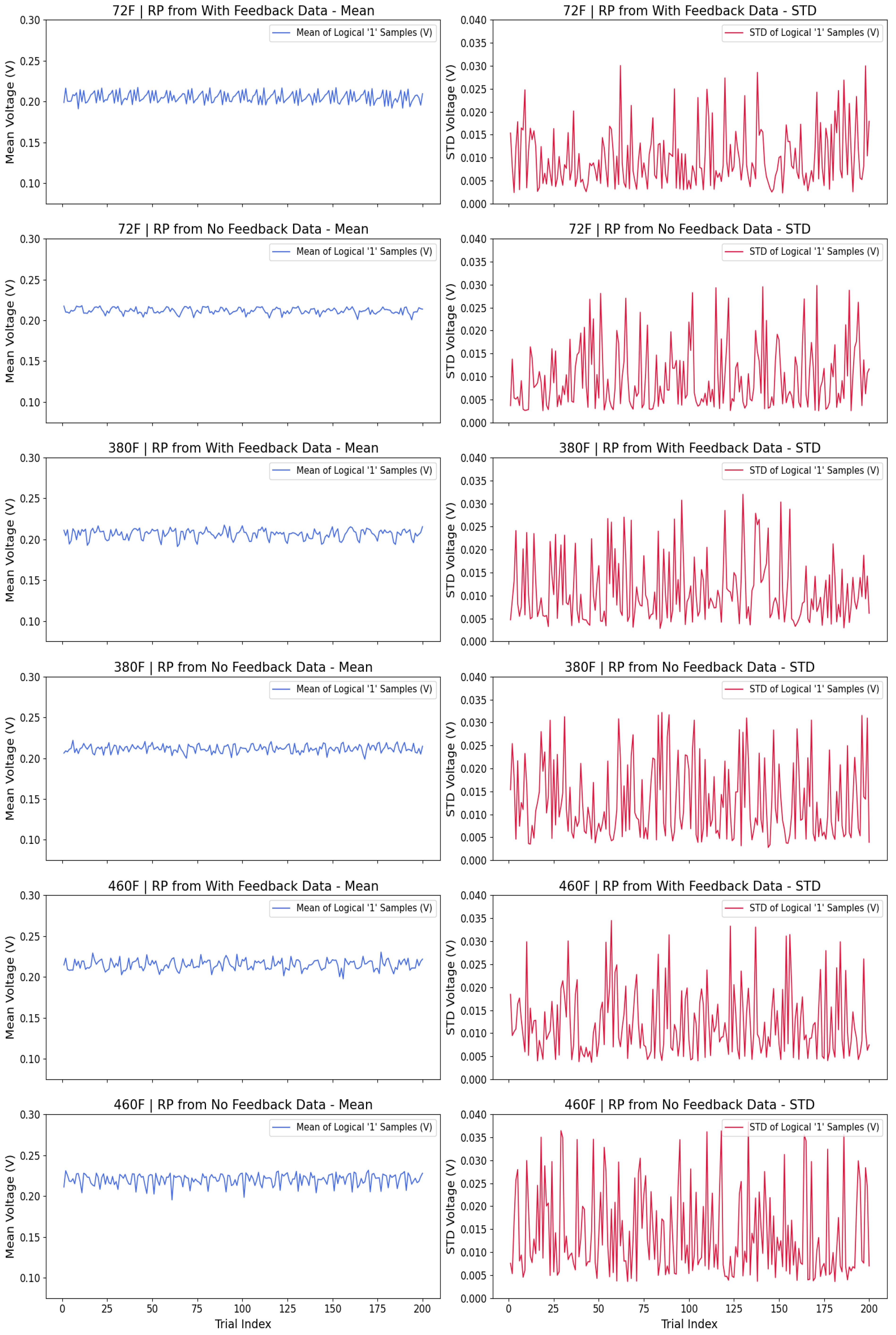 Mean voltage (left column) and standard deviation (right column) of logical ‘ones’ per trial in RPs.