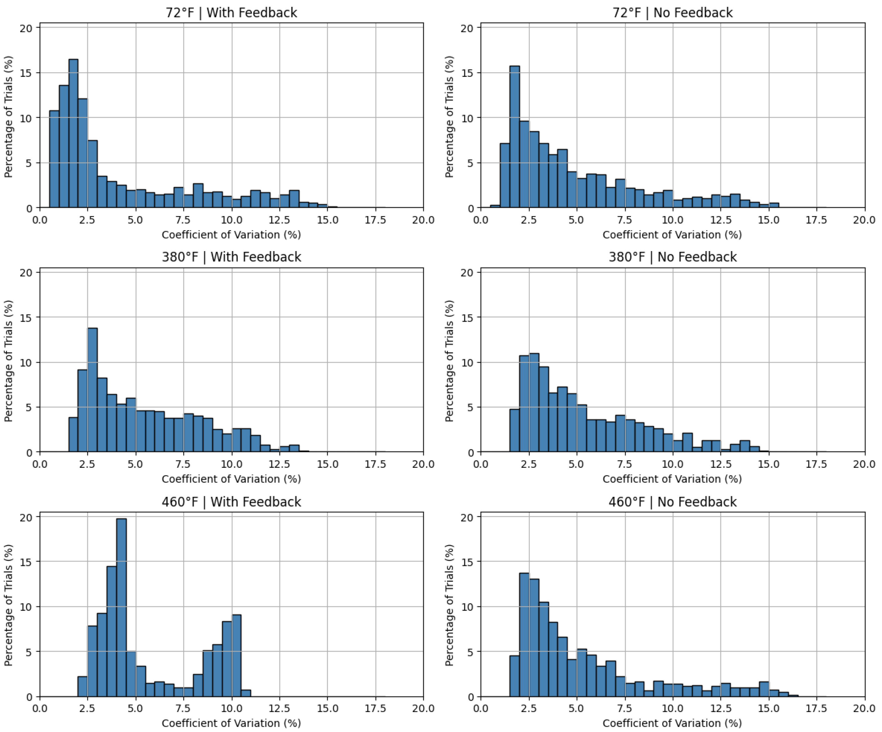 Histogram of the per-trial coefficient of variation (CV) of logical ‘1’ voltages under different temperatures for replay patterns (RPs).