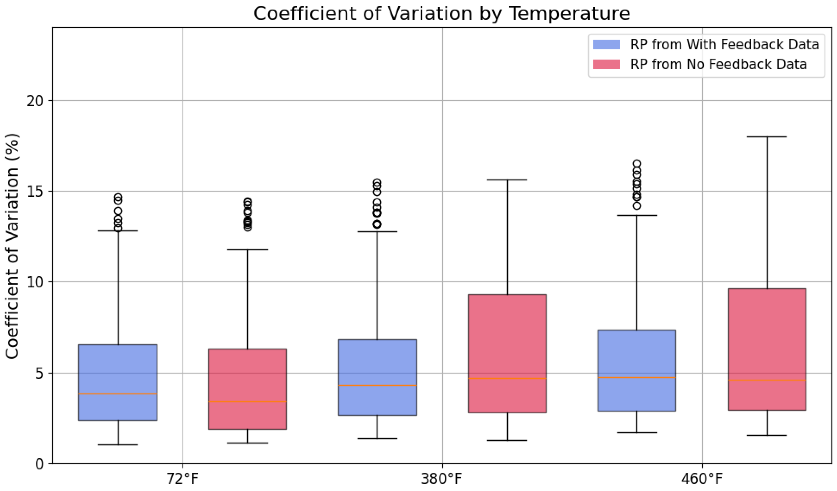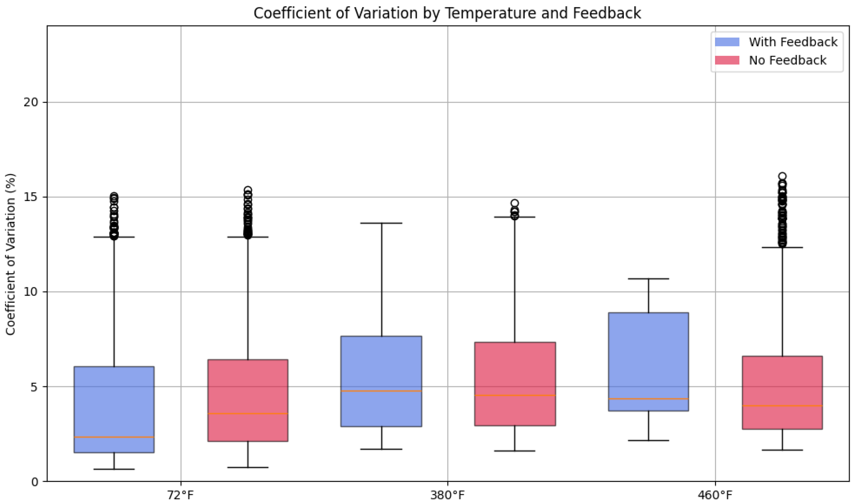 Boxplot of coefficient of variation (CV) of the logical ‘1’ voltages under different temperature and feedback conditions.