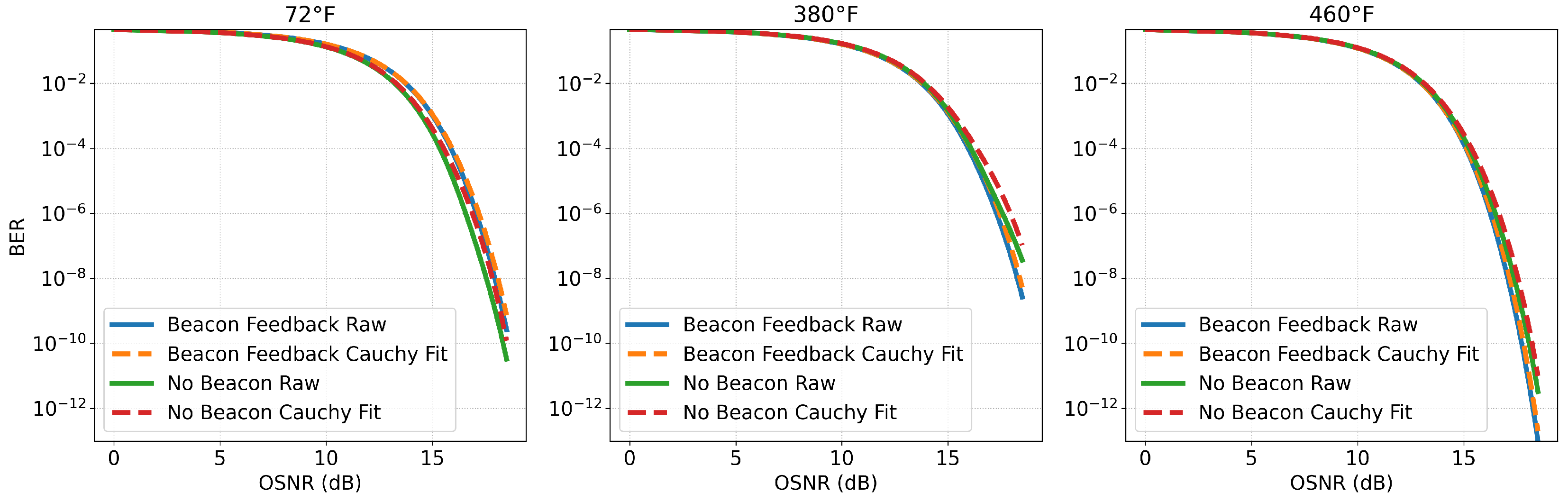 Additionally, the separate beacon channel operating at 660 nm is used to estimate atmospheric turbulence during each trial. The scintillation index, derived from intensity fluctuations in the beacon channel, yields the Rytov variance (