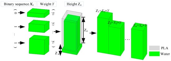 The discussed metamaterial absorber was an array composed of two-dimensional periodic arrangements of water-based unit cells. As shown in Figure 1, the height of the water column that constituted the unit cell microstructure was taken as the design object, and each water column height was binary encoded and represented by a one-dimensional vector X, X = (X1, …, Xn), Xn = (xn1, …, xni). Xn represented the binary sequence of the height of the nth water column in the unit cell. N was the number of water columns arranged periodically in the unit cell. The height of each water column was discretized into I height states. The water height Zn of the nth water column can be expressed as Zn = Xn · Y. Y = (y1, y2, …, yi)T was the weight vector, and each element represented the weight of the i-th position. The permittivity of the water satisfied the Debye formula [24]