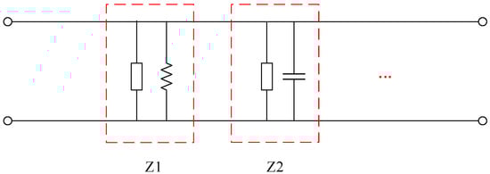 The size of the unit cell was much smaller than the working wavelength, so the unit cell can be considered as a circular scattering particle. Under the excitation with different frequencies, the unit cell generated Mie resonant and field distribution corresponding to each mode, which manifested as a combination of multiple magnetic dipoles in different modes. An equivalent circuit model, as shown in Figure 2, was introduced to analyze the mechanism of electromagnetic response of the designed unit cells. Under the external EM field excitation, a unit cell was regarded as a resonant circuit with multiple parallel branches. Two equivalent branches, Z2 and Z1, formed a resonance for a specific mode. Different combination branches similar to the Z2 and Z1 relationship can be generated for all the resonant modes. Equivalent resonance resulted in maximum impedance loss, thereby achieving a high absorption rate.