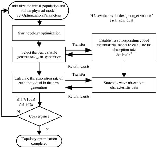 The design objective was to obtain the highest average absorption rate in the target frequency band. fH and fL represented the upper and lower limits of the target frequency range. A(X; fp) represented the absorption at frequency fp. A minimum average absorption rate T was set as a threshold to judge the wave absorption. The optimization formula was