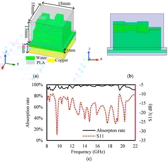 (a) The designed unit cell of the water−based metamaterials absorber, (b) front view, and (c) its EM response characteristics.