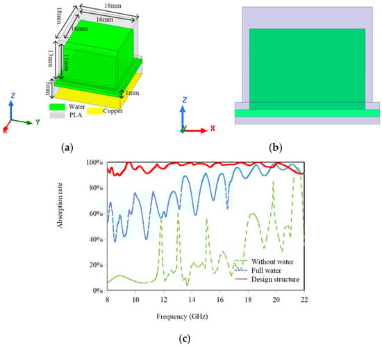 (a) Fully water-filled unit cell (b) front view and (c) the simulation comparison diagram of wave absorption rate.
