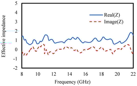 The experimental platform was established in a microwave anechoic chamber to measure the absorption rate of the specimen. Additive manufacturing technology was adopted in 3D printing to fabricate the specimen. The container material was PLA, with a wall thickness of 1 mm. It did not include connecting and assembling components. Micro-pores were left on the upper surface for water injection. The simulated unit cell represented an infinite periodic array. If a finite-size array were used instead of an infinite array, edge effects would occur. The edge effects would mitigate when the array scale was sufficiently large. The preparation cost of large arrays would correspondingly increase. The appropriate array size should be discussed while ensuring that the array characteristics are not substantially affected. After weighing, the size of the prepared array was set to 8 × 8. The specimen was placed horizontally in the center of the test bench. Two antennas connected with a vector network analyzer (VNA) to irradiate the specimen and measure the reflection coefficient S11. Due to the limitation of the maximum test frequency of the VNA, tests were only conducted in the 8 GHz-20 GHz frequency band. As shown in Figure 7c, in the range of 9 GHz-20 GHz, the average absorption rate of the metamaterial absorber was 95.22%, which was basically consistent with the simulation results. Within the testing frequency range, the fluctuations in the simulation and experimental test curves exhibited consistency. The test results verified the reliability of the simulation results within the testing frequency range. Based on the relationship between S11 and impedance, the equivalent impedance of the designed metamaterial absorber was calculated.