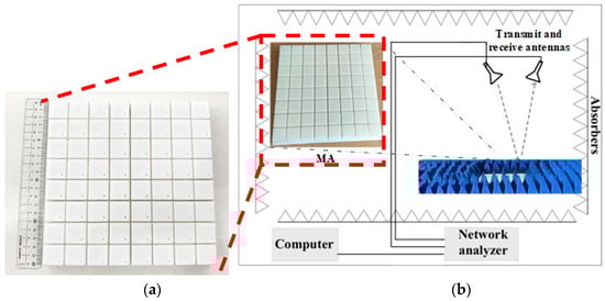(a) The fabricated Water-based metamaterial array specimen. (b) experimental platform and (c) the tested absorption rate curve in TE incident mode.