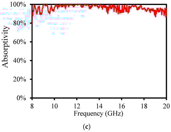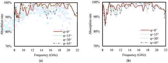 The absorption characteristics of the designed metamaterial absorber under the illumination of incident waves at different oblique incident angles φ in TE and TM polarization modes were analyzed (Figure 9). In the simulation, the metamaterial absorber exhibited high in-band absorption under both TE and TM polarization modes. Meanwhile, with the angle φ increasing, the absorption rate of the designed metamaterial absorber basically remained above 90% in the band of 9 GHz-22 GHz. The designed metamaterial absorber microstructure was insensitive to polarization mode and incident angle.