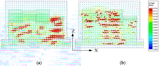 To study the working principle of the designed metamaterial absorber, the magnetic field distribution of this metamaterial absorber at the resonant frequency was simulated, and the results were plotted in Figure 8. For the absorption peak at 9.6 GHz, the magnetic field was mainly concentrated in the middle of the water structure, indicating that there was a strong magnetic resonance at this frequency. Similarly, at the absorption peak at 18.86 GHz, the magnetic field still showed strong magnetic resonance and was mainly distributed in the middle and upper layers of the water structure. It was the combined effect of these magnetic resonance rings that enabled the designed structure to achieve efficient absorption effects. In the absorption process dominated by magnetic resonance, the magnetic polarization rate α mm played a major role. Under the excitation of an external magnetic field Hi, the magnetic dipole moment can be generated. At the same time, due to the bi-anisotropic characteristics of the structure, the unit had an asymmetric current distribution in the XY plane. Under the excitation of incident waves, magnetoelectric coupling may be induced, and the cross-polarization rate αem ≠ 0 (orαme ≠ 0)