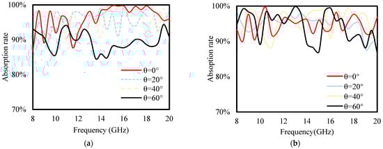 The absorption rate of the metamaterial absorber for the wave from different oblique incident angles () in TE and TM polarization modes was also analyzed. The tested results were shown in Figure 10. In the TE mode, the absorption rate was above 90% when θ was less than 50°, and it remained above 85% when θ = 60°. In the TM mode, the absorption rate can also reach more than 85% when θ is less than 60°.