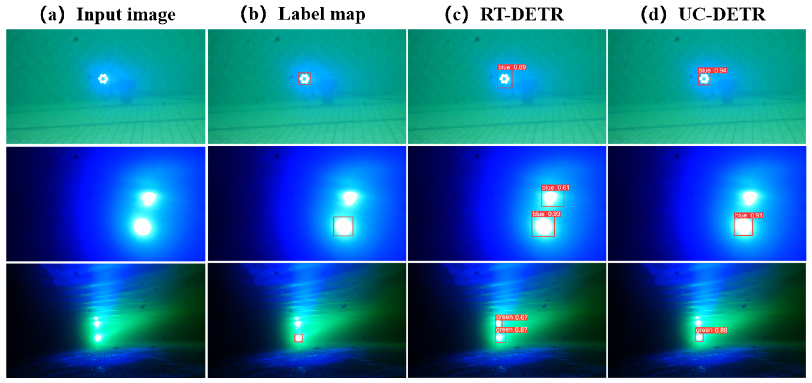 - A hybrid encoder enhanced with Lightweight Dynamic Convolution (LDConv) [20], together with a dedicated underwater light-spot dataset (11,390 images covering 15–40 m transmission range, ±45° deflection, and three illumination levels at noon, evening, and late night), was developed. Under this setting, the improved model achieves AP50 = 97.4% on the test set, outperforming the RT-DETRv2-M baseline by 12.7%.