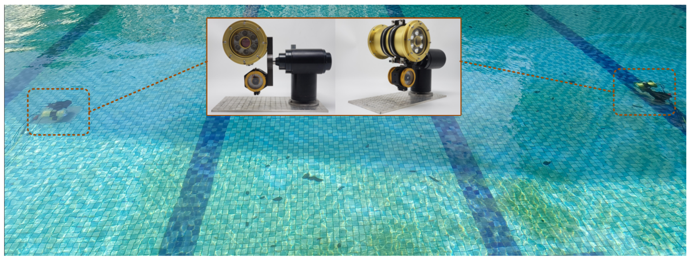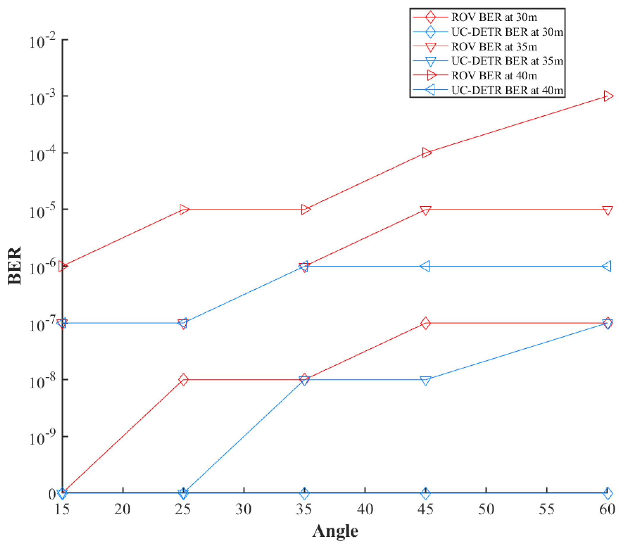 - A UWOC prototype with automatic alignment: a CCD acquires light-spot images in real time, and the improved RT-DETRv2 outputs the spot center online; the host converts the center offset to a deflection angle via perspective projection and, combined with real-time optical power, performs attitude adjustment for closed-loop alignment. In a pool environment, through multi-angle alignment experiments, error-free transmission has been achieved over 30 m, and the BER at 40 m has remained in the 10−7–10−6 range.