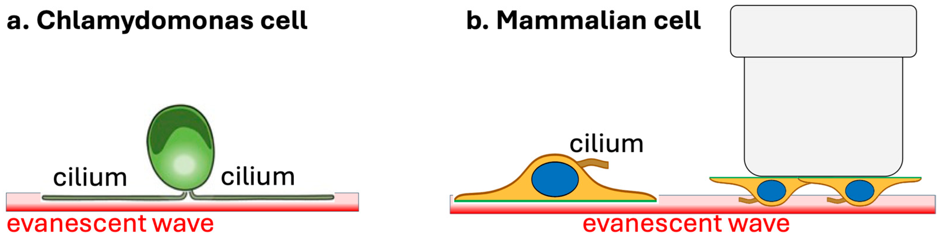 Chlamydomonas cells naturally adhere to smooth surfaces where the TIRF evanescent field forms, as schematically shown in