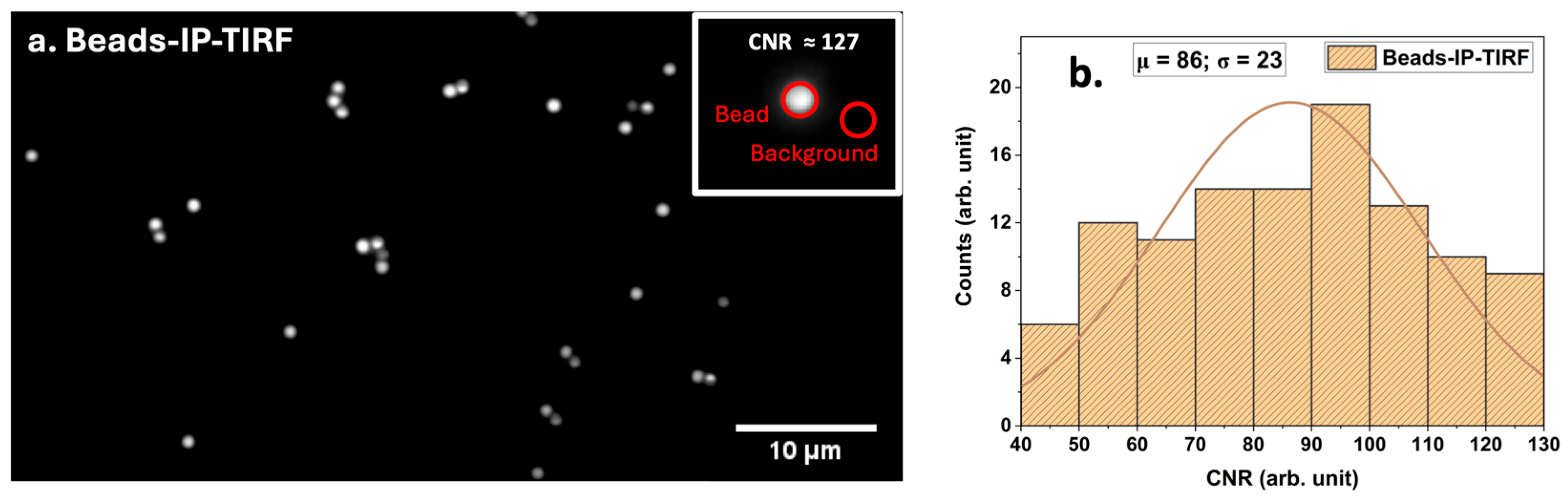 Figure 3a shows a representative IP-TIRF image of beads, with the inset highlighting a single bead exhibiting a CNR of ~127.