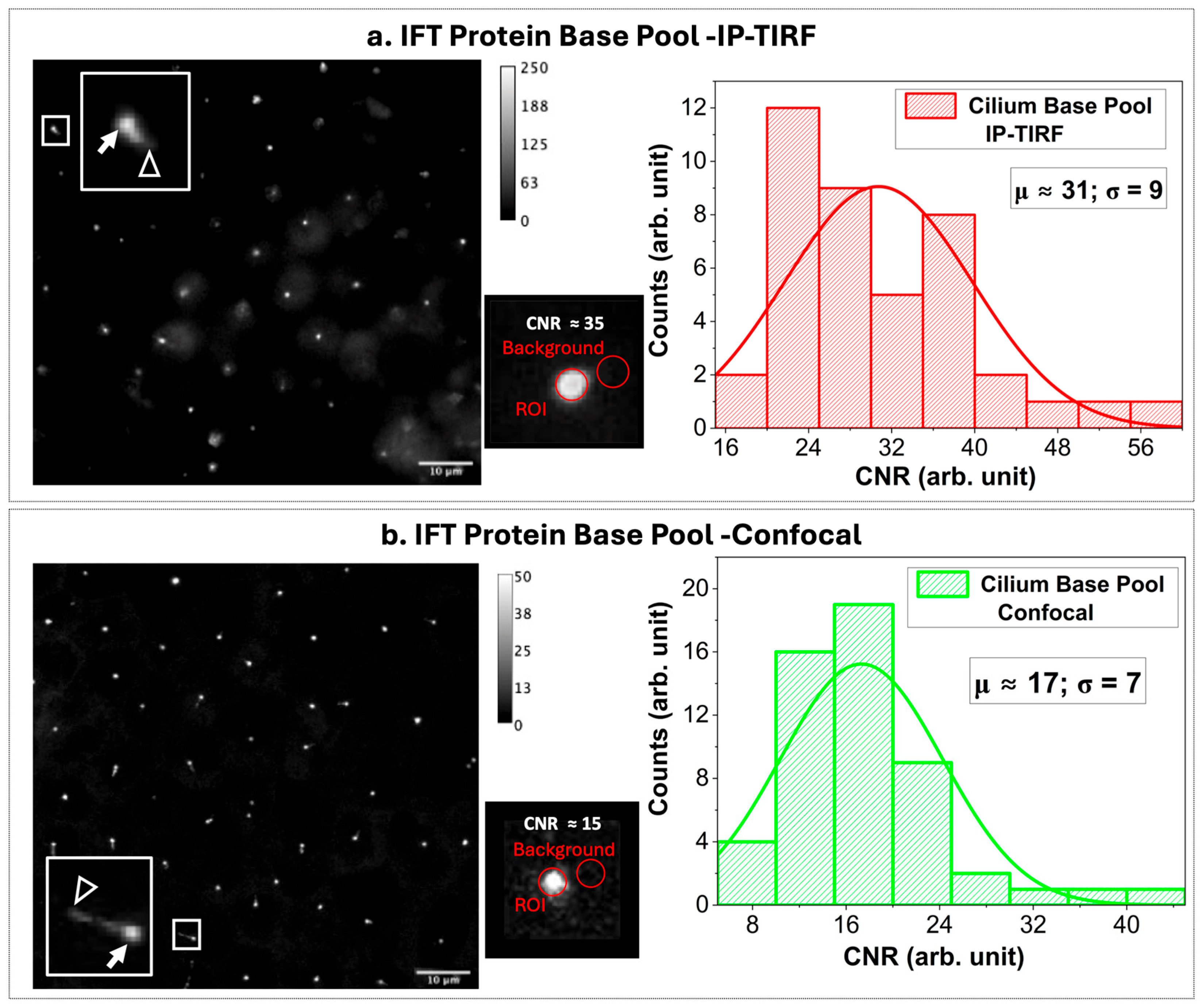 Figure 4a,b highlight the IFT protein base pool of single cilia, with CNRs of ~35 and 17 obtained using IP-TIRF and scanning confocal microscopy, respectively. The CNR distributions for N~40 (IFT protein base pools are shown in the left panels) yield a mean CNR of μ~31 and a standard deviation of σ~9 for IP-TIRF, and a mean CNR of μ~17 and a standard deviation of σ~7 for scanning confocal microscopy. Therefore, on average, the mean CNR obtained with IP-TIRF (31 ± 9, N~40) was approximately 1.8-fold higher than that of scanning confocal microscopy (17 ± 7, N~50).