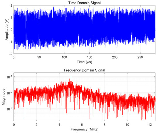 Figure 3 presents an example of the raw signal acquired from the FMCW system. The signal inherently contains multiple noise sources originating from the laser, photodetector, and electronic circuits. This example corresponds to a target distance of approximately 5 m, where the beat frequency is centered around 5 MHz. As the ranging distance increases, the frequency spectrum undergoes noticeable broadening, which becomes the dominant source of interference. Under such conditions, the signal-to-noise ratio (SNR) falls below 5 dB, complicating reliable signal extraction. When the distance is further extended, this spectral broadening becomes even more severe, leading to continued SNR degradation.