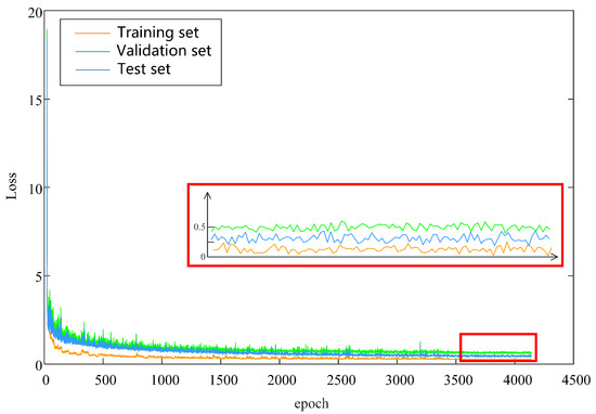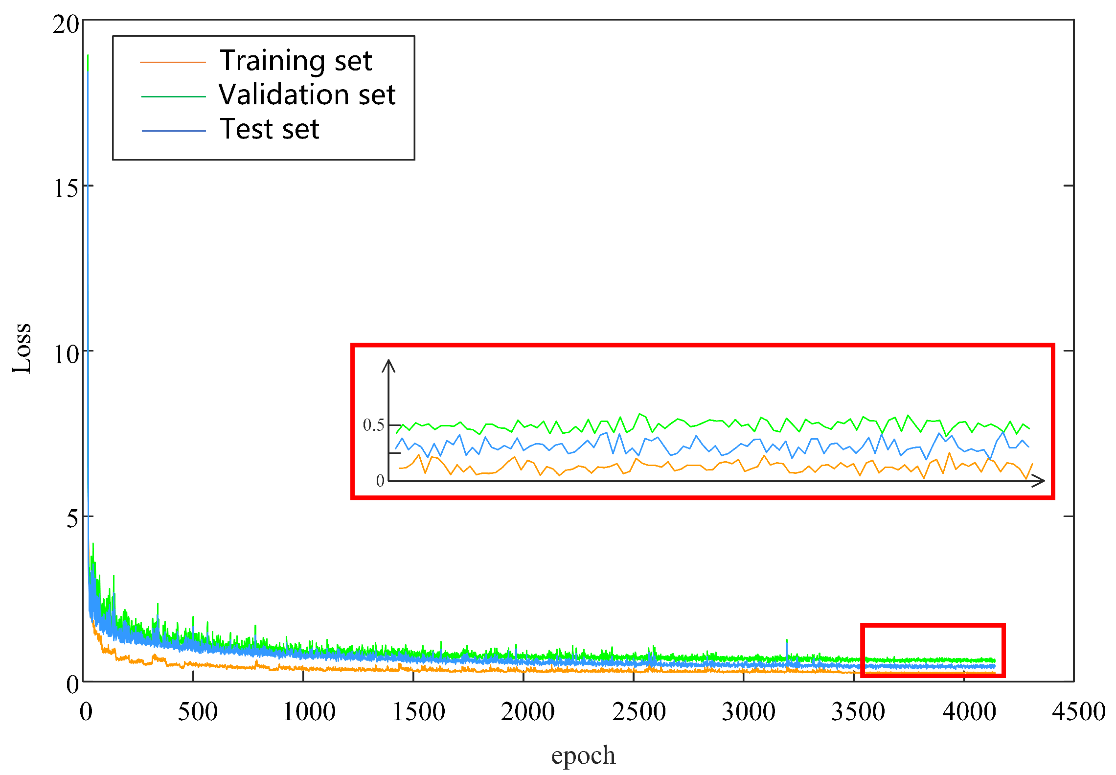 The inset panel provides a magnified view of fine-grained fluctuations in the loss curves between approximately epochs 3800 and 4200. During this period, minor discrepancies among training, validation, and test losses are observed, further indicating stable and well-generalized learning. Overall, the experimental results demonstrate that the model consistently achieves strong performance across all datasets without signs of overfitting. The model initially learns rapidly and then gradually stabilizes, producing low and consistent loss values on both the validation and test sets, which reflects its robust generalization capability.