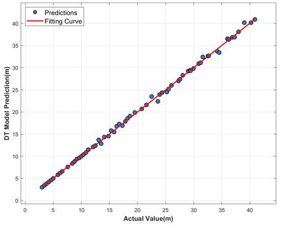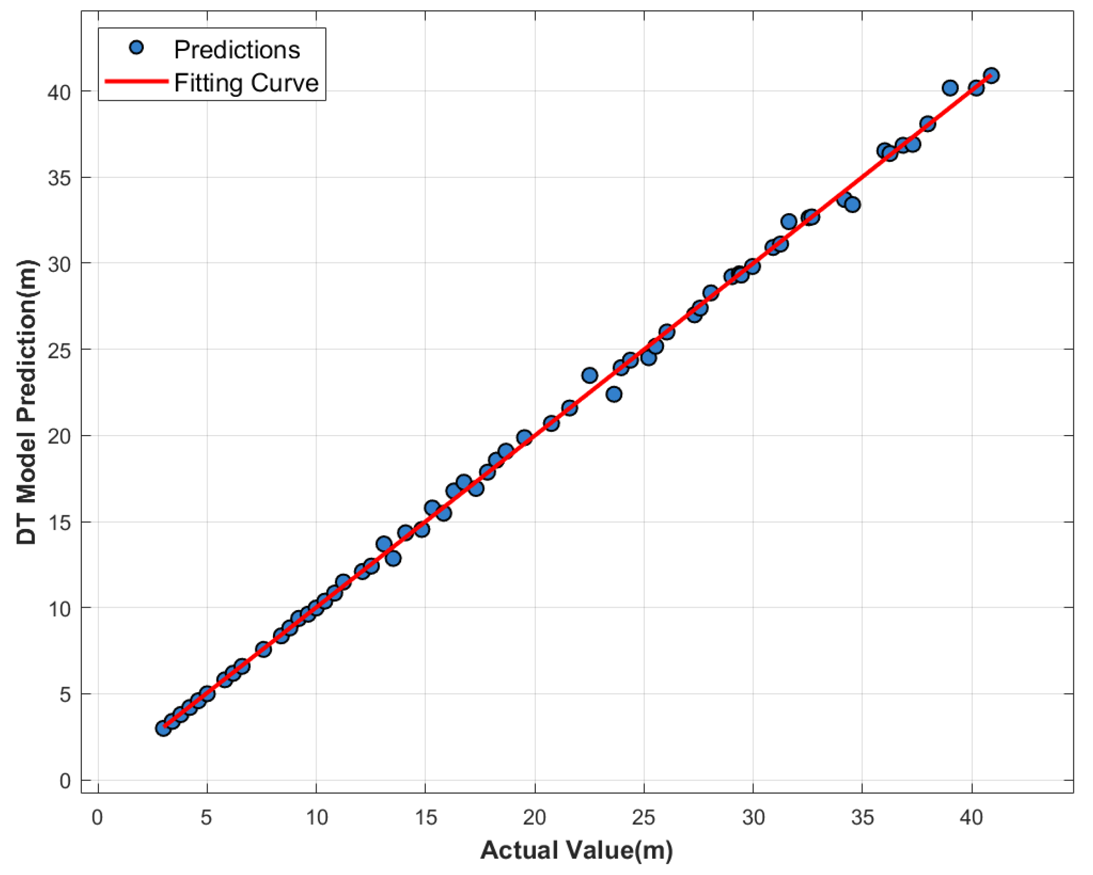 Figure 6, the blue dots represent the distance predictions of the DT model, with the x-axis corresponding to the true values and the y-axis to the predicted distances. Ideally, all points should lie along the diagonal line where the predicted and true distances are equal. The red curve represents a second-order polynomial fitted to the predicted points, capturing the overall prediction trend. The blue points exhibit a clear linear distribution along this fitted curve. Across the prediction range of 3–40 m, the points are evenly distributed around the fitted curve, indicating consistent stability throughout the measurement range. The positive slope of the fitted curve, closely aligned with the 45-degree reference line, confirms that the model effectively captures the positive correlation between true and predicted distances.
