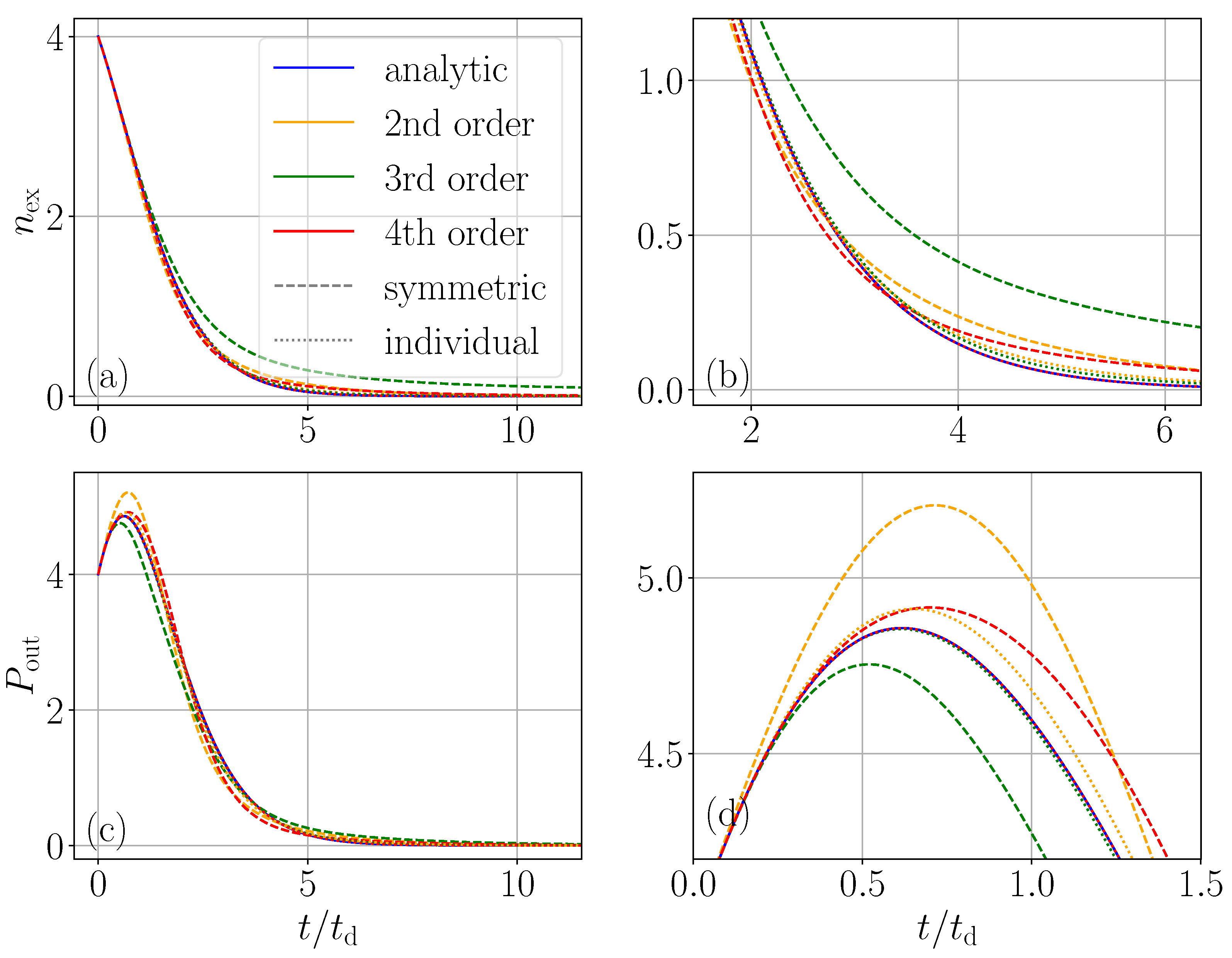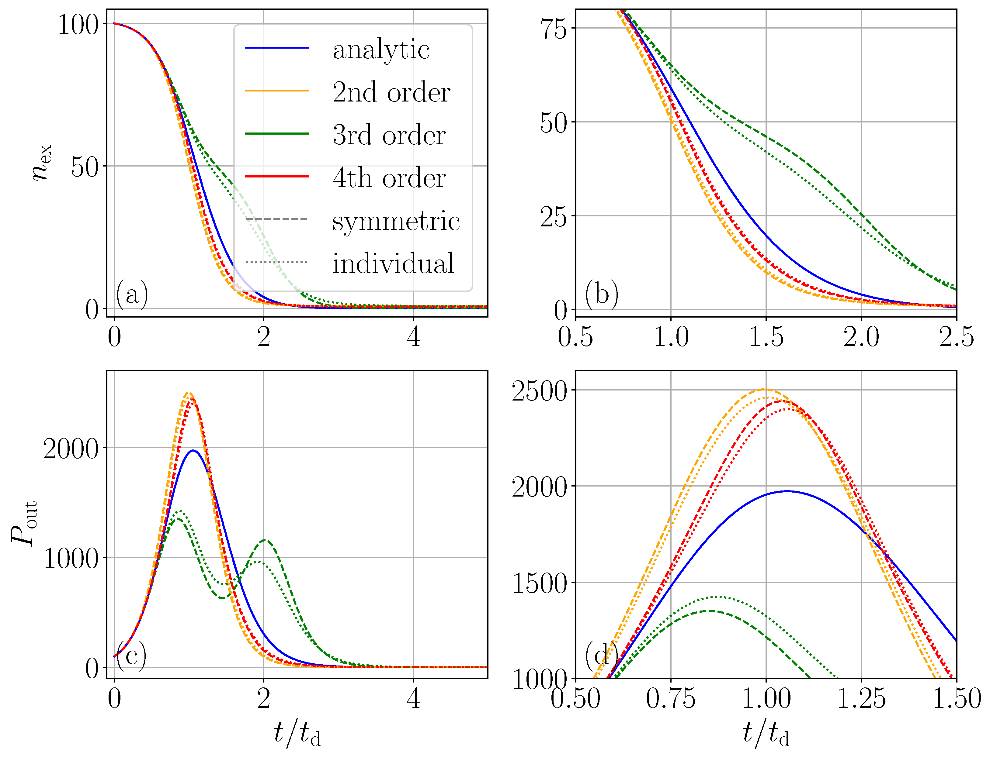 now behaves indistinguishably from the exact result based on solving the full master equation. Again, as above, the third-order expansion exhibits a worse agreement than the second order. Interestingly, the individual spin-based expansion here converges very well and way better than the symmetric collective approach.