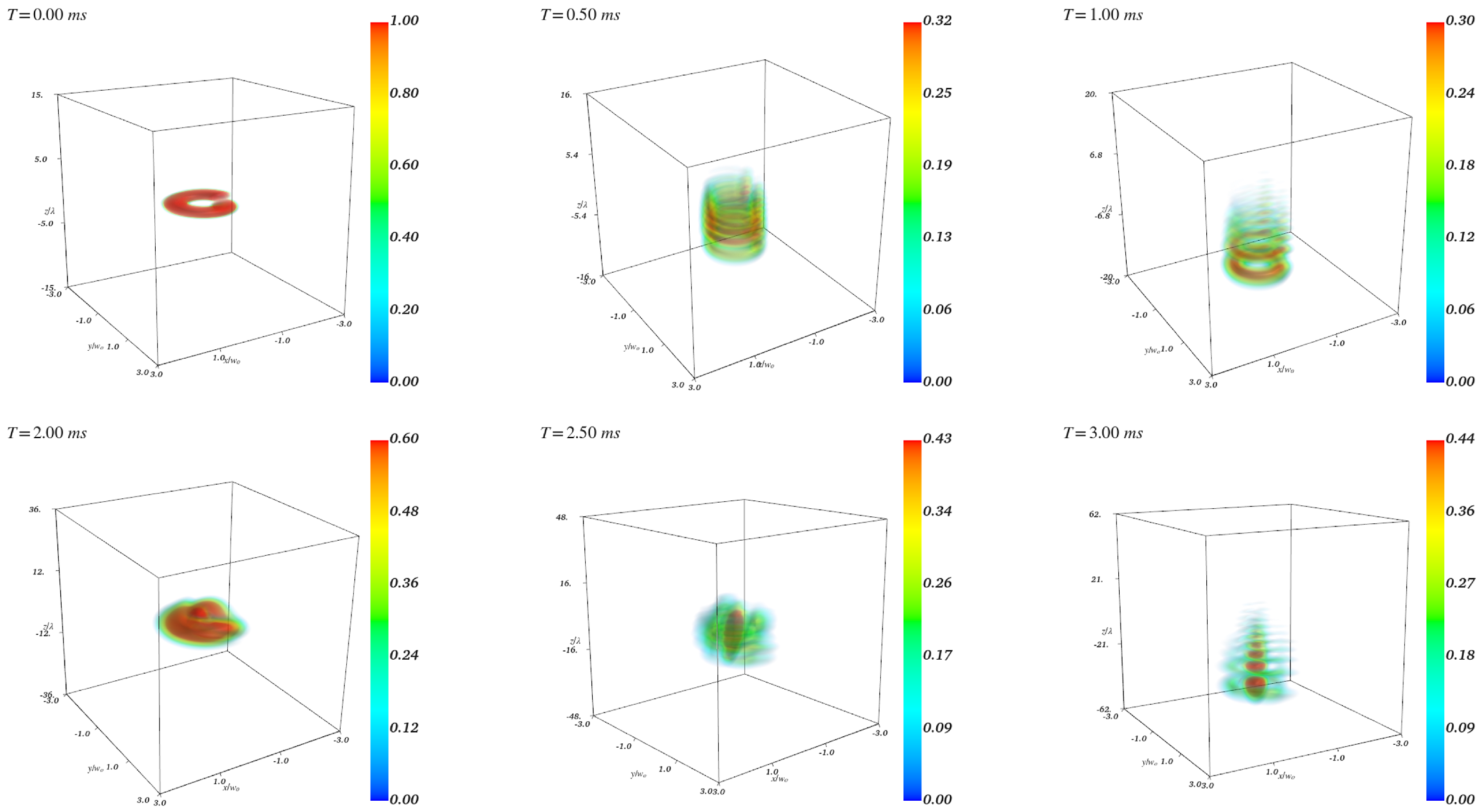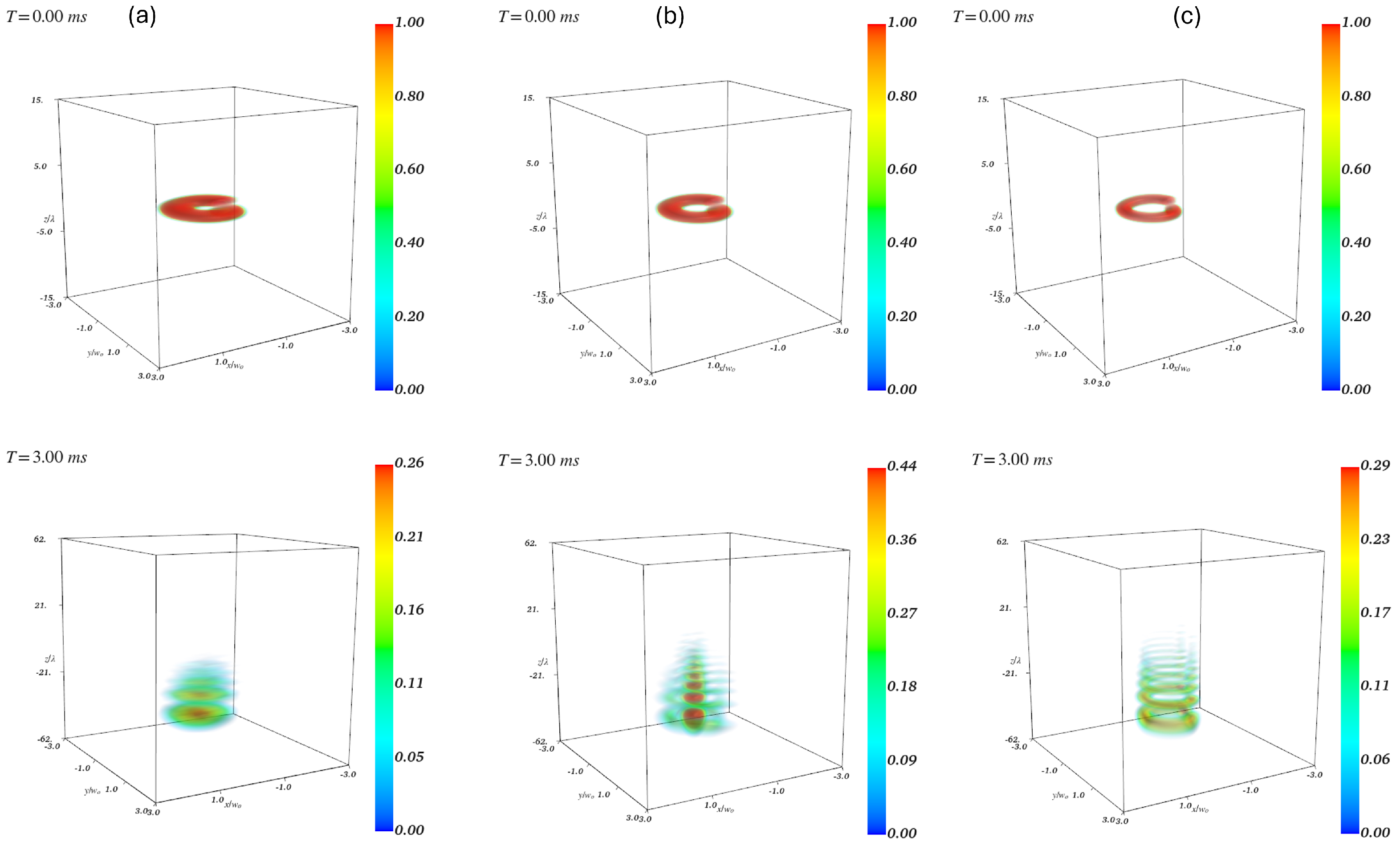 - For : A pronounced central peak develops during free fall, with a sharper and more confined density maximum at the center of mass. This suggests a stronger self-focusing effect, likely driven by the more intricate initial twist structure and associated higher spatial confinement. The condensate appears to resist radial dispersion more effectively than in the case, with maximum probability density regions (presented in red color) close to 0.80. Simultaneously, strong interference fringes appear, especially in the lower region, indicating intensified nonlinear wave mixing during expansion.