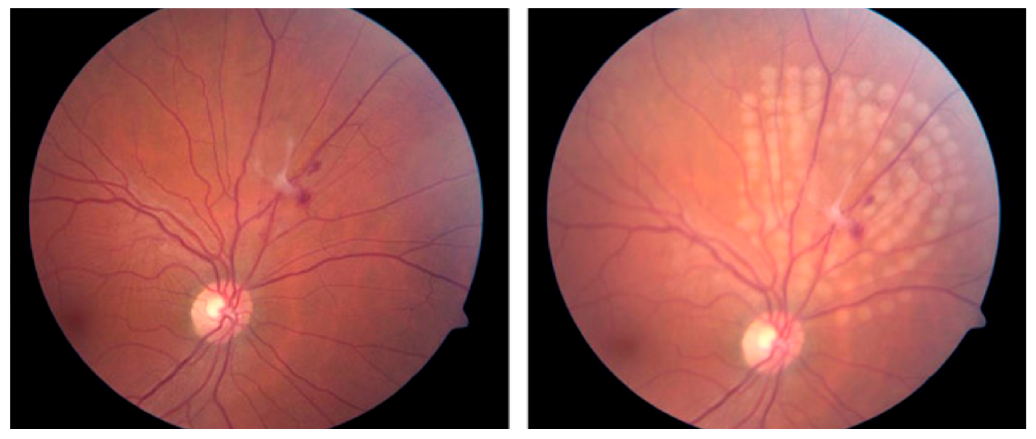 - Nagpal, M.; Marlecha, S.; Nagpal, K. Comparison of laser photocoagulation for diabetic retinopathy using 532-nm standard laser versus multispot pattern scan laser. Retina 2010, 30, 452–458. [Google Scholar] [CrossRef]