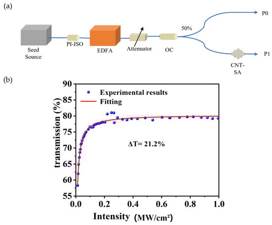 (a) Schematic diagram of the balanced dual-detector system; (b) Nonlinear absorption curve of CNT-SA.