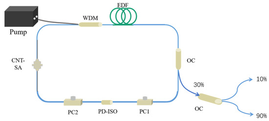 Hybrid mode-locked erbium-doped fiber laser. Pump: pump source; WDM: wavelength-division multiplexer; EDF: erbium-doped fiber; OC: optical coupler; PD-ISO: polarization-dependent isolator; PC1, PC2: polarization controllers; CNT-SA: Self-made carbon nanotube saturable absorber.