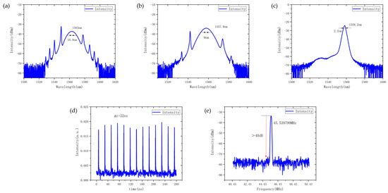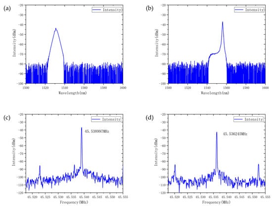 The dual-frequency pulses were subsequently separated using an external 1530/1550 CWDM. The measured spectra after separation are shown in Figure 7a,b. The separated spectral widths were consistent with the original dual-wavelength spectrum, and the RF signals were more cleanly separated (Figure 6c,d). After separation, the output powers of the 1430.76 nm and 1555.92 nm pulses were 0.3 mW and 0.8 mW, respectively. Compared to the previous case, the power difference between the two pulses was more pronounced.