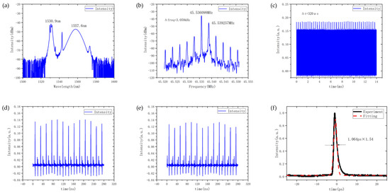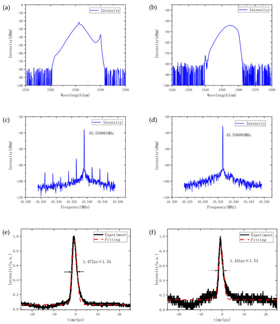 After separation, the output powers of the 1530.9 nm and 1557.6 nm pulses were 0.225 mW and 0.524 mW, respectively. Both were comparable in magnitude but lower than the total output power measured directly from the laser cavity, mainly due to spectral losses introduced by the CWDM filtering process. To accurately evaluate the temporal and spectral features of the two ports, RF spectra and autocorrelation traces were measured using a spectrum analyzer and an optical autocorrelator, as shown in Figure 5c,d. The RF spectrum of the 1550 nm port exhibited a clear single peak, further confirming successful pulse separation. In contrast, the 1530 nm port RF spectrum contained a small residual contribution from the 1557.6 nm pulse, owing to the broad spectral bandwidth of the 1557.6 nm component, which extended into the 1530 nm region and could not be fully filtered by the CWDM. From the autocorrelation traces in Figure 5e,f, noticeable temporal broadening was observed in both separated pulse trains, with the pulse widths increasing to 1.477 ps and 1.441 ps for the 1530 nm and 1550 nm ports, respectively.