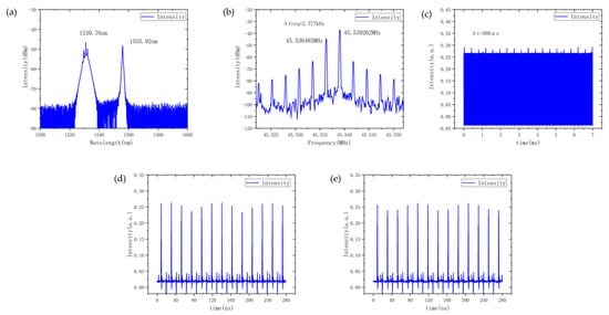 By appropriately adjusting PC1 and PC2 without changing the pump power, dual-wavelength dual-frequency pulses with different repetition frequency differences were obtained. Figure 6a shows the measured mode-locked spectrum, with central wavelengths at ~1430.76 nm and ~1555.92 nm, corresponding to a wavelength separation of 25.16 nm, indicating a certain degree of spectral tunability. The total output power was measured to be 2.1 mW. The RF spectrum of the pulse trains is presented in Figure 6b. A distinct dual-frequency peak structure was again observed, with repetition frequencies of ~45.539262 MHz and ~45.536485 MHz, corresponding to a repetition frequency difference of ~2.777 kHz. Compared with the previously reported dual-frequency pulses, the longer-wavelength mode-locked pulse at 1555.92 nm exhibited a narrower optical spectrum, which was also reflected in the RF spectrum as a lower repetition frequency peak relative to the 1430.9 nm component. On a large time scale, the oscilloscope trace revealed clear temporal interference fringes (Figure 6c), with a measured period of ~380 μs, consistent with the repetition frequency difference. Furthermore, time-domain measurements in Figure 6d,e once again showed the relative drift of the two pulse trains, producing two periodically scanning pulse sequences on the oscilloscope, with one sequence exhibiting a lower intensity compared to the other.