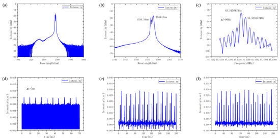 With the pump power kept constant, further adjustment of PC1 and PC2 to control the intracavity polarization and loss led to the emergence of a dual-frequency pulse state with an extremely narrow optical spectrum. Figure 8a shows the narrow-band mode-locked spectrum, where a sharp and narrow peak was observed around 1557 nm, while no significant peaks were detected at other wavelengths. A magnified view of the spectrum (Figure 8b) reveals that this sharp feature actually consisted of two closely spaced wavelength components at 1556.62 nm and 1557.64 nm, with a spectral separation of only 1.02 nm, representing a remarkably small wavelength separation. The corresponding RF spectrum, measured with a spectrum analyzer (Figure 8c), displayed a dual-frequency peak structure similar to the previous results, confirming that the cavity was operating in a dual-frequency state. The two pulse trains exhibited repetition frequencies of 45.536076 MHz and 45.536213 MHz, with a frequency difference of 137 Hz. The output pulse sequences were further measured using a photodetector and oscilloscope, as shown in Figure 8. In a large time scale, clear temporal interference fringes with a period of ~7 ms were observed, in great fitting with the measured repetition frequency difference. Figure 8e,f illustrates the relative temporal drift of the two pulse trains, again confirming asynchronous mode-locking. Although no intracavity polarization beam splitter (PBS) or PMF was used, additional polarization diagnostics were performed at the output port by inserting an external PBS and a PC to analyze the vector characteristics and polarization states of the emitted light. The results showed that the two RF peaks did not exhibit relative intensity variation when the external PC was adjusted; instead, the intensities of both decreased or increased simultaneously. This behavior indicates that the two asynchronous pulses shared nearly identical polarization states, consistent with the characteristics of wavelength-multiplexing dual-frequency mode-locking.