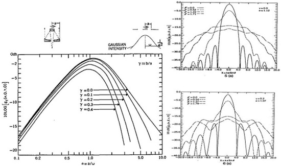 (Left) Far-field gain of a centrally obscured but focused optical telescope with a primary mirror diameter equal to 2a and a secondary mirror diameter (if any) equal to 2b as a function of the ratio α = a/w, where w is the beam waist radius and the ratio of the secondary and primary diameters is γ = b/a. (Upper right) Far-field pattern of an unobscured telescope (γ = 0) without defocusing (solid line) and with two levels of defocusing (2 dashed lines). (Lower right) Same as upper right figure but with a secondary mirror (γ = b/a = 0.2).