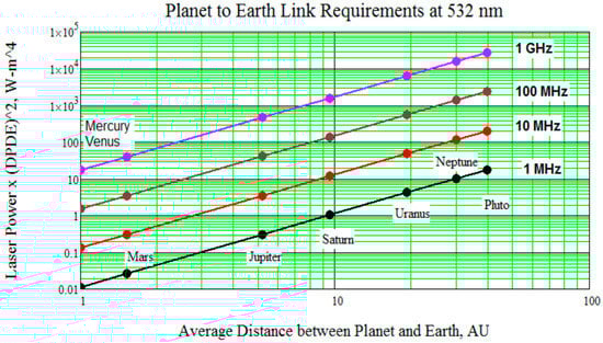 The present author has previously analyzed the system requirements for transmitting a given data rate via a 532 nm laser link between Earth and other planets within the solar system [6]. The results are summarized in Figure 2, which plots the laser link requirements (i.e., the transmitted laser power multiplied by the product of the transmit and receive telescope diameters squared) on the y-axis versus the distance between the Earth and the planetary terminal on the x-axis. Each of the four lines represents a different data rate, i.e.,1 Mbps, 10 Mbps, 100 Mbps, and 1 Gbps. The mean distance between Earth and the various planets within our solar system are indicated by the labelled black dots (within our solar system at the frequency-doubled Nd:YAG wavelength of 532 nm). The corresponding y values for other wavelengths λ can be obtained by simply multiplying the y-axis values in Figure 2 by (λ/532 nm)2. Clearly, shorter wavelengths imply lower transmitted laser powers and/or smaller telescopes, but they also imply narrower beams and more stringent coalignment between collaborating telescopes.