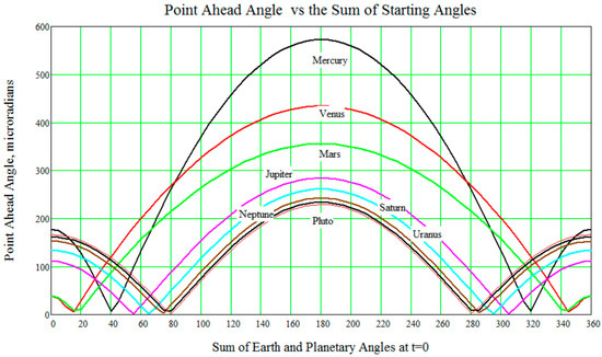 In Figure 3, the maximum point-ahead angle occurs when the Earth and the planet are on opposite sides of the Sun (180°). This is due to the fact that (1) the range between them, and therefore the light travel time, is maximized, and (2) their orbital velocities are in opposite directions, and therefore, the relative velocity is additive. The point-ahead angles decrease for the outer planets because of their slower angular velocities. Smaller secondary peaks occur at 0° (or 360°) for all the planets because (1) the orbital velocities are in the same direction, and therefore, the relative velocity is reduced, and (2) the light travel time is minimized. Intermediate angles where the point-ahead angle drops to near zero would be advantageous for mutual acquisition of the two terminals and occur twice per Earth year.