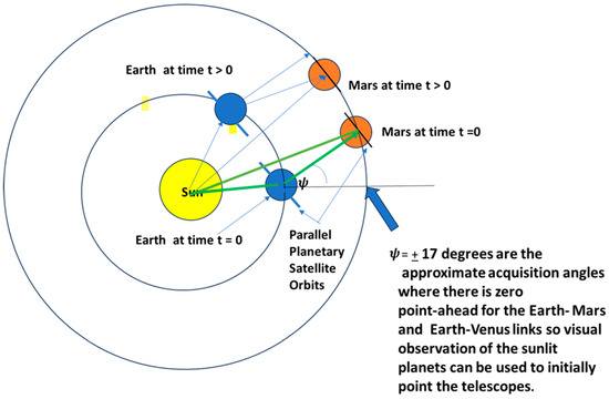 Earth–Mars example. Initial coalignment of the Earth terminal with the mapper at Mars takes place after the satellite pair have been placed in parallel orbits perpendicular to the common orbital plane about the Sun. When the two planets reach the geometry in the figure where the angle ψ between the Earth–Mars line and the Sun–Earth line is approximately ±17 degrees; the point-ahead angle for both terminals is roughly zero.