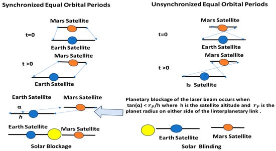 When both the period and phase of the two orbits are matched (synchronous orbits), the satellites always have mutual visibility, except as they (1) approach a configuration where the Sun either blocks transmission or blinds the terminal farthest from the Sun (Mars) or (2) the beams are blocked by the host planets themselves. In the latter case, blockage duration can only be reduced by increasing the Earth and planetary satellite altitudes such that they maintain the same orbital period and phase, i.e., based on planetary mass.