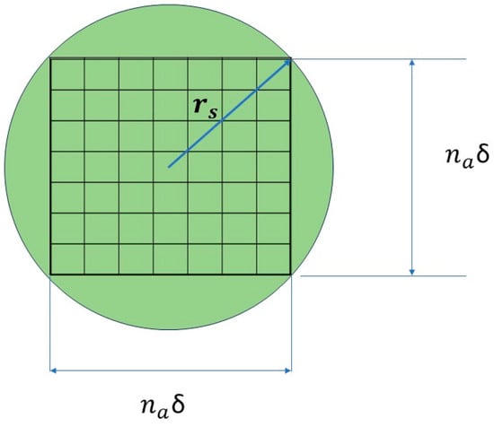 where rs is the radius of the circular surface area adequately illuminated by the lidar and, as before, Ap = 0.5 m2 is the ATLAS lidar telescope primary aperture. We now assume that the lidar return is imaged onto a square detector array containing nb = na2 pixels monitoring a central square subtended by the radius rs, as in Figure 6. This implies that
