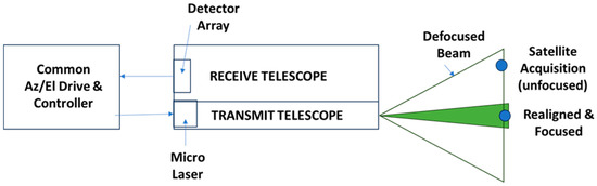 One can increase the size of the laser beam waist through a modestly sized magnifying telescope, which, in turn, can reduce the divergence of the beam in the far field by several orders of magnitude [4]. For example, prior to the turn of the century, the mm accuracy satellite laser ranging systems transmitted a few mJ, 120-picosecond pulses at rates on the order of 10 Hz via a narrow tube coaligned with a meter-class receive telescope [3]. As indicated by Equation (3), this resulted in an extremely small fraction of the light intercepting the array of retroreflectors on the satellite. However, by expanding and transmitting the beam through the receive telescope, the beam intensity at the satellite was increased by over four orders of magnitude, allowing the use of significantly lower beam energies and/or smaller telescope apertures. In addition, meter-long lasers could now be replaced by microlasers a few mm long, whose short length could result in multikHz pulse rates and orders of magnitude lower pulse energies, significantly reducing potential eye hazards for ground personnel or passengers in overflying aircraft. The author and his colleagues at NASA’s Goddard Space Flight Center developed the SLR2000 system, which increased the measurement rate by over 2 orders of magnitude to 2 kHz using a 30 cm diameter transmit/receive telescope [3].