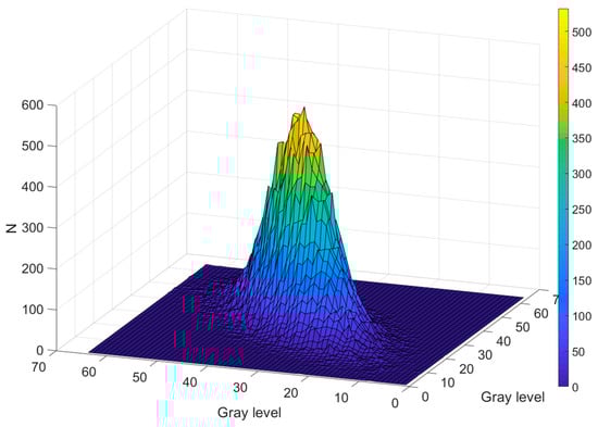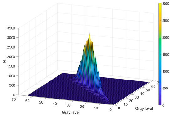 A number of eight intensity levels is typically used to analyze the properties of images [31,32,33,34]. The TS generated for DLS were analyzed using 64 levels of intensity instead; a total of 64 gray levels were used to ensure a more accurate variation in the MI with the diameter of the particles in suspension. Figure 4 and Figure 5 depict a 3D representation of the GLCM, having the number of co-occurrences, defined in Section 2.3, on the Z axis and the gray level on X and Y axis. The GLCM in Figure 4 was computed for the TS corresponding to a particle diameter of 35 nm and Figure 5 was computed for the TS corresponding to a particle diameter of 3000 nm.