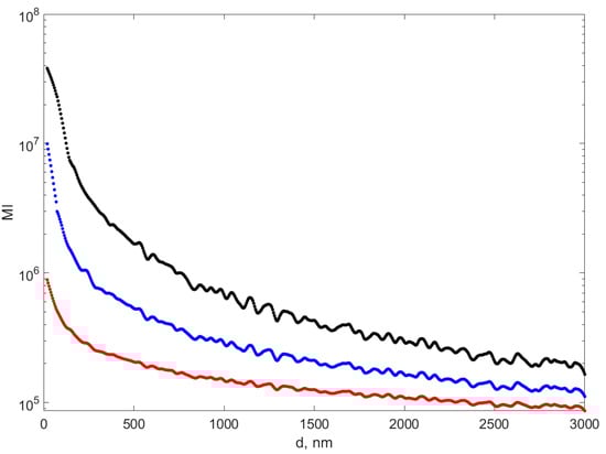 The variation in the first three order moments of the GLCM with the diameter used for simulating the TSs. The black dots represent M3, the blue dots represent M2, and the red dots represent M1.