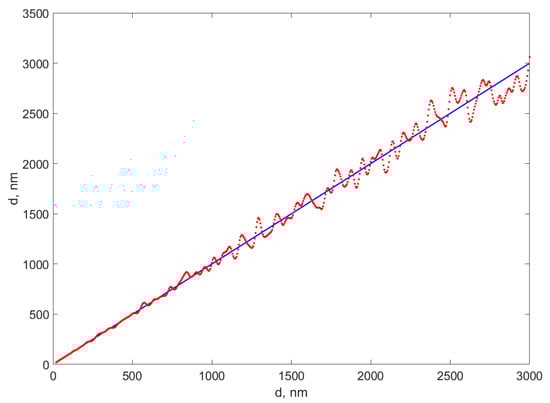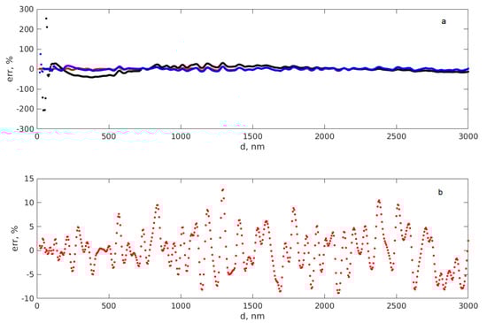 As described in Section 2.2, we generated time series (TSs) for each diameter in the range of 20–3000 nm with a 5 nm step using a custom MATLAB code. The procedure of estimating the average diameter, as described in Section 2.1, was employed and the diameters for each TS were assessed. They were found to be very close to the diameter used for generating the TS, within a relative error below 1%.