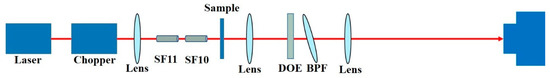 Schematic Diagram of the Experimental Optical Path. Ti:sapphire femtosecond laser (755 nm, 230 fs), SF11 (350 mm) and SF10 (300 mm) dispersion media, a 2 × 2 Dammann diffraction grating (DOE) with ~80% efficiency, narrow-band filters positioned at the 4f spectral plane, a 4f imaging system composed of two achromatic lenses with focal lengths of 75 mm, and a CCD camera (3648 × 5472 pixels, 2.4 µm pixel size, 12-bit dynamic range).