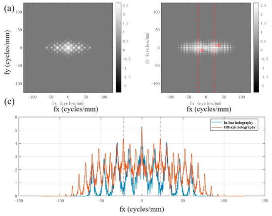 As described in the theoretical section, in an on-axis holographic system, the light from the object and its conjugate image propagate in the same direction. This prevents their complete separation in the spatial frequency domain, leading to the phenomenon of “ghosting.” While this characteristic poses challenges for phase recovery, the on-axis structure offers higher spatial bandwidth utilization compared to off-axis holography, enabling full utilization of the detector’s sampling potential. Therefore, we first compare the off-axis and on-axis holographic spectra, as shown in Figure 2.