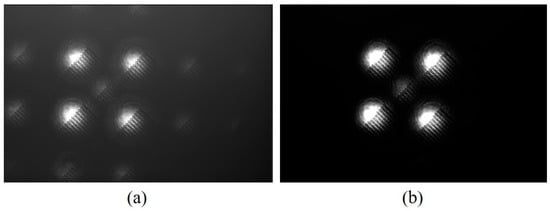 This 2 × 2 configuration was chosen to balance angular separation, energy uniformity, and broadband stability. It provides sufficient isolation among diffracted beams while maintaining high optical throughput. Although higher-order Dammann gratings (3 × 3, 4 × 4) can theoretically increase the number of channels, their stronger wavelength sensitivity may compromise uniformity. The proposed 2 × 2 DOE thus offers an optimal balance between efficiency and system robustness for the present experimental conditions.