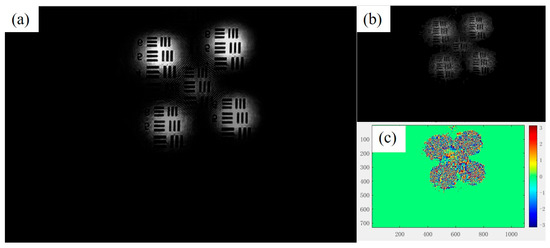 Based on the collected multi-plane defocused holographic data, the object’s complex amplitude field is numerically reconstructed using angular spectrum propagation combined with an iterative phase recovery algorithm. The reconstruction process involves multiple iterations of forward and backward propagation in the frequency domain, progressively optimizing the complex amplitude distribution of the object field through combined intensity and phase constraints. Figure 7 presents the overall reconstruction result of the resolution plate. As shown in Figure 7a, the reconstructed image effectively restores the structural information of the resolution plate, with the stripe distribution exhibiting high consistency with the experimental object. This demonstrates that the adopted algorithm achieves high-fidelity reproduction of the object’s two-dimensional projection information under static conditions. Furthermore, the experiment separately extracted and analyzed the amplitude component of the wavefield. As shown in Figure 7b, the reconstructed amplitude exhibits intensity distribution characteristics consistent with the geometric structure of the resolution plate in the grayscale image. The pseudocolor image provides a more intuitive observation of signal intensity contrasts across different regions. Particularly in the high-frequency stripe areas, the system’s imaging performance after stray light suppression becomes evident, with sharper edge transitions. The recovery of amplitude information not only validates the accuracy of the two-dimensional imaging experiment but also provides reliable amplitude constraints for subsequent phase reconstruction. In addition to amplitude information, the experiment also reconstructed the phase distribution of the object field. In addition, we conducted a three-dimensional particle field holographic experiment, as shown in Figure A3. Therefore, the trillion-frame-frequency all-optical three-dimensional holographic imaging method proposed in this paper demonstrates promising potential in theoretical modeling, algorithm design, and experimental validation. With further advancements in optical design, algorithm optimization, and hardware technology, this method is expected to play a significant role in broader scientific and engineering applications, including biomedicine and ultrafast dynamics.
