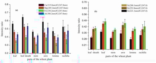 Intensity of (a) Mg, Ca, Al, and Fe, and (b) Si emission lines at different wavelengths in various sections of the wheat plant. Reproduced from Ref. [124] with the permission of Springer.