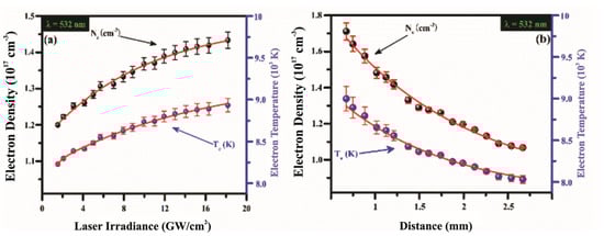 (a) The evolution of the electron excitation temperature of the plasma in a target (a) as a function of laser intensity ranging from 0 to 20 GW/cm2 at a wavelength of 532 nm; (b) The spatial variation in the electron density and excitation plasma temperature inside of a sample. Reproduced from Ref. [141] with permission of Multidisciplinary Digital Publishing Institute.