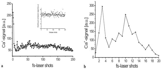 The spread of bound calcium ions (Ca2+) inside a sunflower stem’s periphery cell wall. For every femtosecond laser pulse, the plasma radiation was monitored and examined in the spectral interval of 380 nm to 410 nm. The Ca+ signal is obtained by integration over the Ca+ lines at 395 nm. The integrated continuous radiation between 368 nm, and 375 nm is the source of the background emission. (a) The Ca2+ spread is displayed with the inset, highlighting the continuum radiation signal. The applied fluence laser was 120 J/cm2. (b) The Ca2+ spread is shown, including greater resolution, evaluated with a laser pulse fluence of 55 J/cm2. a.u. = arbitrary units. Reproduced from Ref [51] with the permission of Springer.