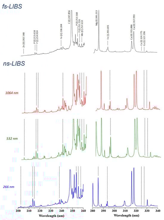 A systematic comparison of ns-LIBS (6 ns Nd:YAG laser at 1064, 532, and 266 nm) and fs-LIBS (60 fs Ti:sapphire laser at 880 nm) was conducted by Arantes de Carvalho et al. [91] to analyze a range of heterogeneous composite samples, including pellets from 31 plant species. They demonstrated that the fs-LIBS offered several benefits for quantitative macro- and micronutrient analysis in pelletized leaves from crops such as sugarcane, soy, Citrus, maize, and coffee. Their findings emphasized that the validation and calibration processes in fs-LIBS were less affected by the plant material’s matrix composition compared to ns-LIBS.